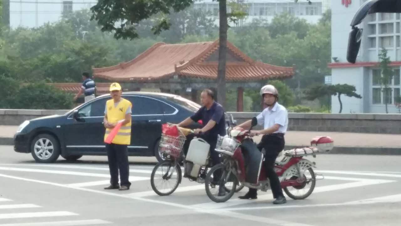 周一至周五,志愿者们在早、晚交通高峰期,提前到达志愿服务岗位,统一穿着制式马夹、戴制式太阳帽、持制式警示旗,不畏酷暑,顶风冒雨,对过往行人不走斑马线、非机动车越线停车及乱闯红灯等不文明交通行为进行合理劝导,并积极帮助外地来泰人员和其他对周边环境不熟悉的路人,为他们指引方向,找寻目的地。