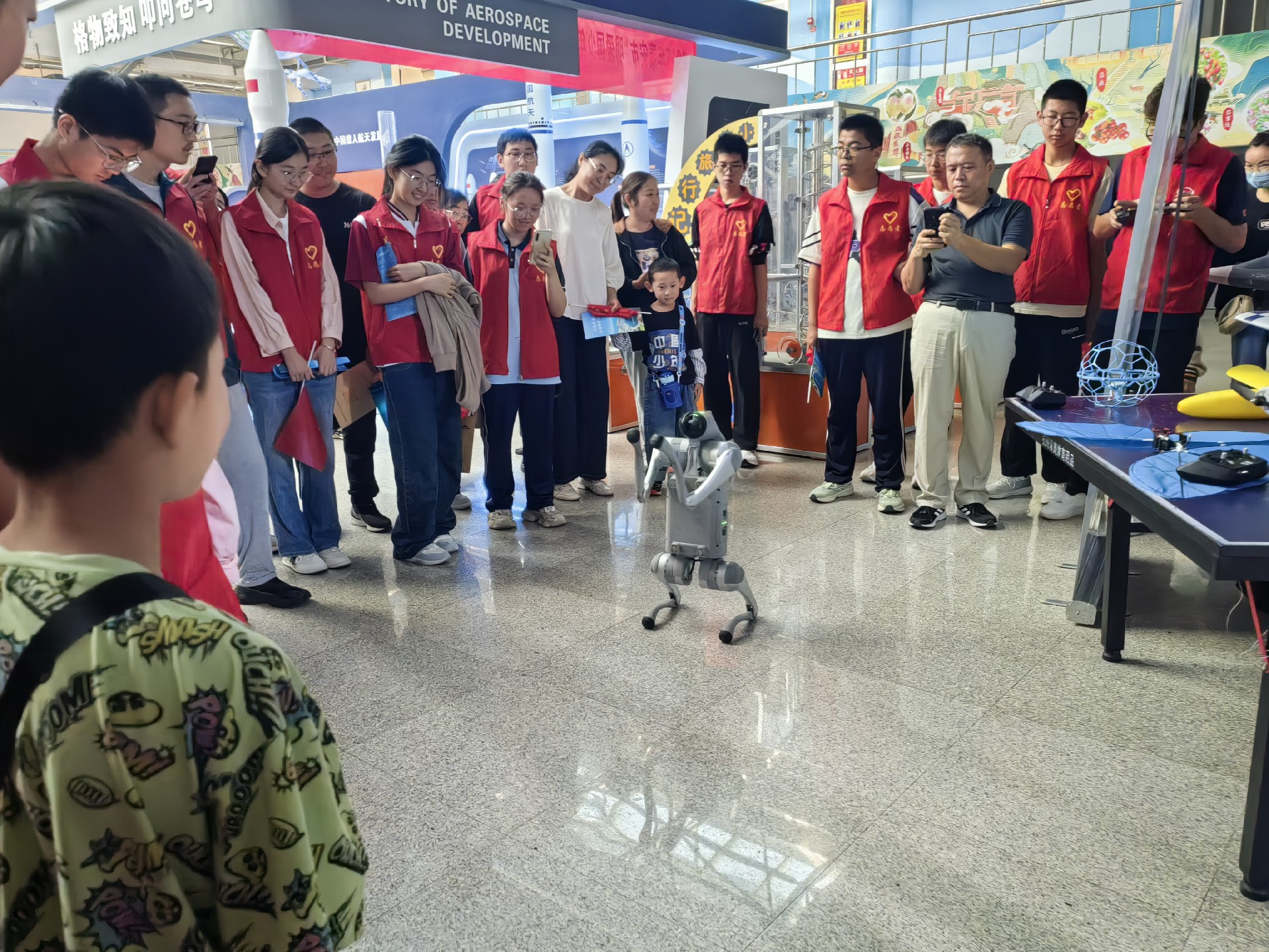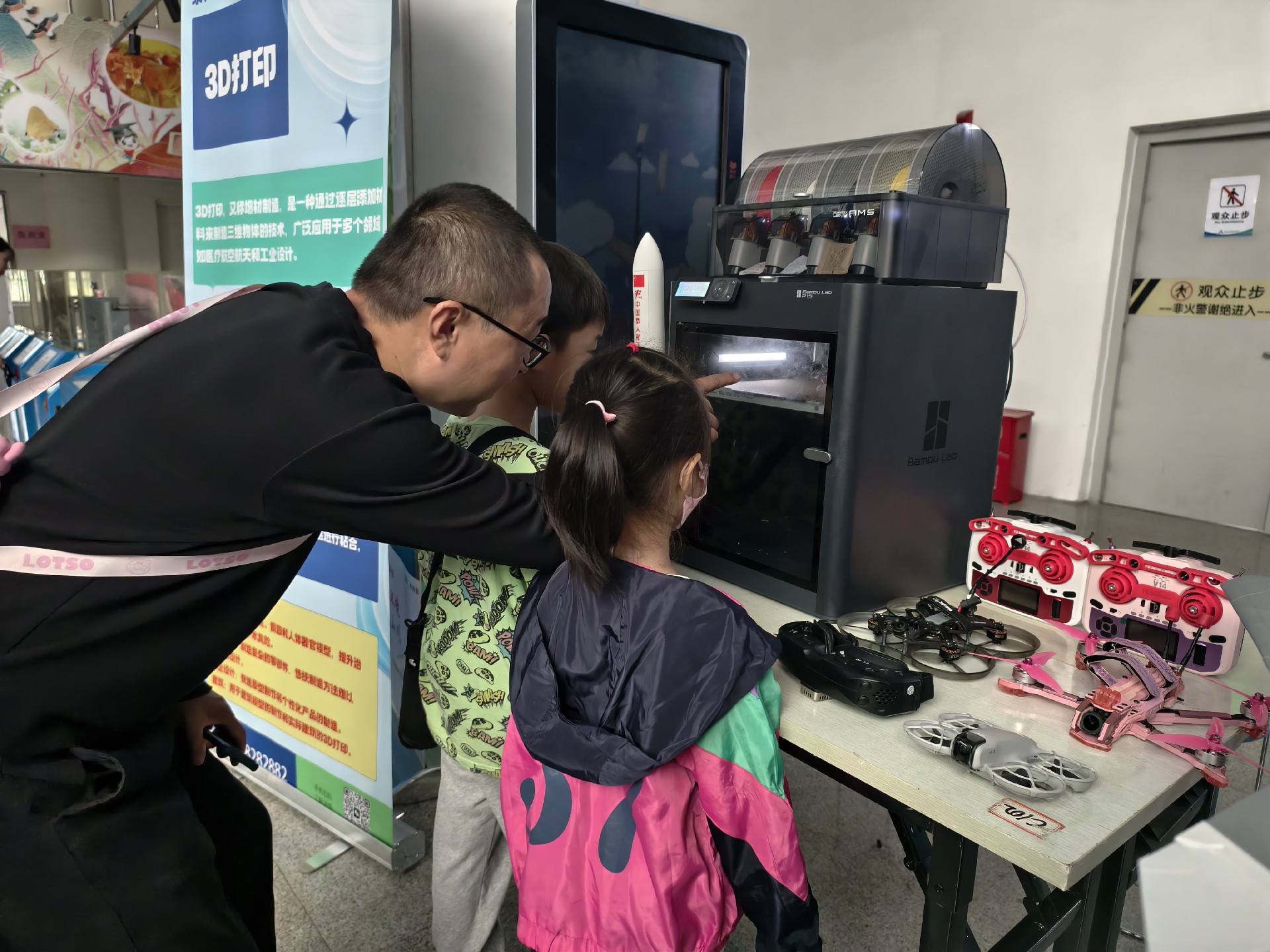 在二楼展厅,仿真机器狗成为全场焦点——它们不仅能单腿站立"比心",连贯完成"前空翻",还随着《孤勇者》旋律翩翩起舞,引得小朋友们跟着拍手合唱。室外广场上的无人机表演同样精彩,无人机在空中划出彩色轨迹,组成五角星等造型,引来观众阵阵喝彩。3D打印体验区内,孩子们在辅导员指导下认真设计飞机轮船模型。