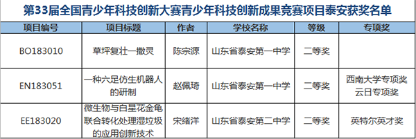 泰安一中陈宗源同学的《草坪复壮一撒灵》,研究项目能够降低草坪管理难度和管理成本,改善草生长、提高抗逆性、延长绿期利于生态环境平衡。该项目获得全国二等奖。