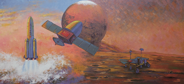 此画由3部分构成:左侧可以看到长征五号遥四运载火箭携带天问一号升空;中间部分描绘了天问一号飞向火星的场景,可以看到橘红色的火星以及火星上白色的极冠;右侧是祝融号在火星表面巡视,背景是火星灰红色的天空。